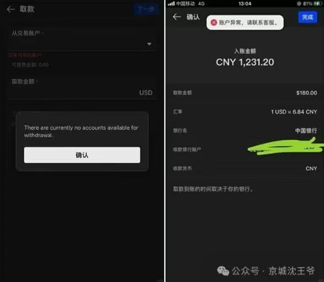 与此同时,他另一个账户里还有180美金的佣金,系统提示“账户异常”,无法提取。