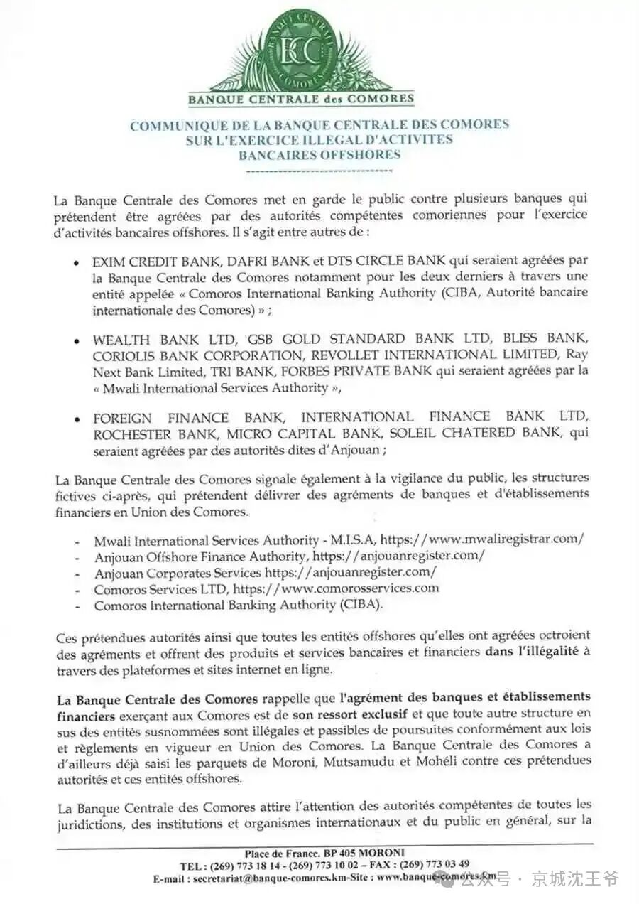 这不是捏造,连科摩罗自己的中央银行(BCC)都看不下去了。2022年6月,科摩罗中央银行发布了一份官方公报,明确警告公众:一些机构在非法声称可以向科摩罗联盟发放银行和金融机构许可证。公报中直接点名,所谓“Mwali International Services Authority”、“Anjouan Offshore Finance Authority”等,均为“虚假机构”,没有任何法律地位。