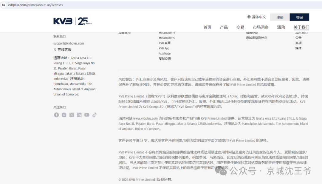 再来看看这家平台的“监管光环”。官网明明白白写着:受科摩罗联盟昂儒昂离岸金融管理局(AOFA)授权,持国际经纪和结算所牌照 L15626 / KVB 提供金融服务。